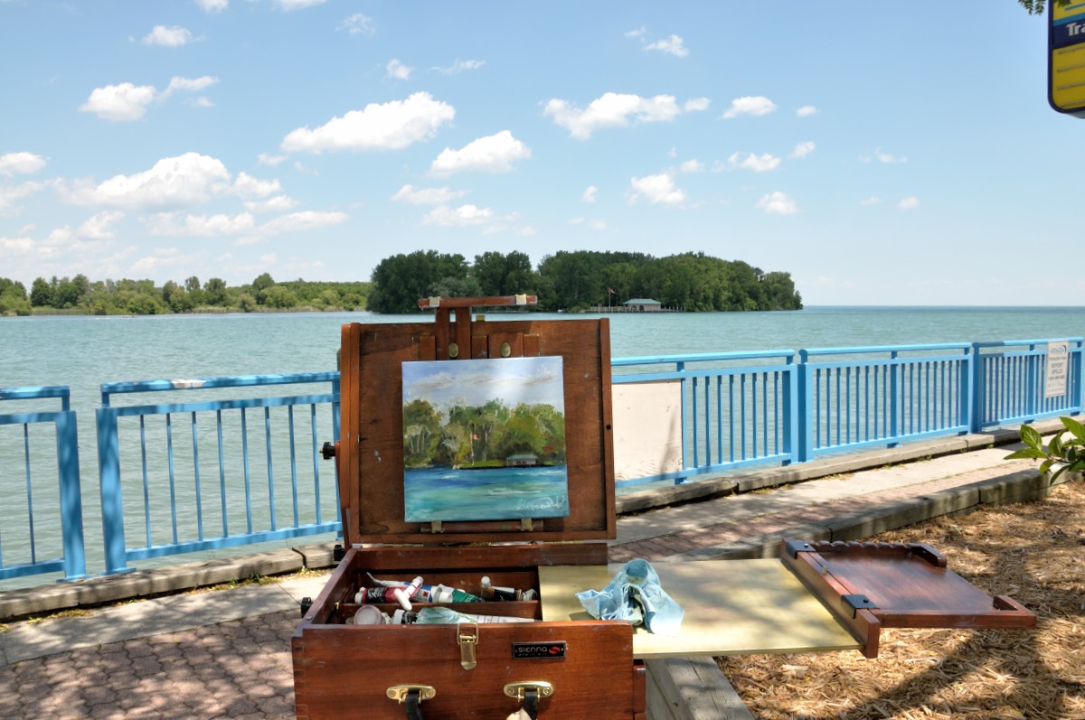 Peche Island is located at the entrance of the Detroit River. Monday was a lovely day. There was rain in the forecast, but I was delighted that the weather network was way off on their predictions. The day was sunny, warm with a bit of a breeze. Some of my group had difficulty hanging onto their paintings, but I had no issues at all with my new Sienna all in one Pochade Box. I have mixed feelings about my new box. There are some great features, but a few drawbacks.
